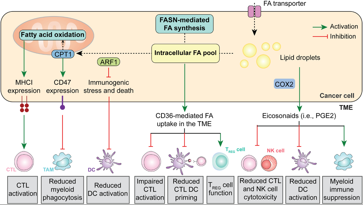 该研究描述了癌细胞如何增加从肿瘤微环境中摄取脂肪酸和内源性脂肪酸合成,这对CTLs和DCs产生免疫调节效应。包括增加癌细胞表面的MHC Class I表达,提高CD47表达以限制巨噬细胞的吞噬摄取,以及抑制免疫原性细胞死亡(ICD)以防止DCs的显著激活。此外,高浓度的FAs在TME中对CTLs和DCs有直接的免疫抑制作用,并增加TREGs介导的免疫抑制。最后,癌细胞可以将储存在脂滴中的FAs转化为免疫抑制性的环氧合酶,如前列腺素E2(PGE2)。
