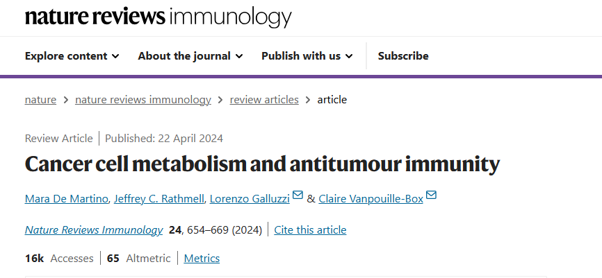 2024年4月发表在《Nature Reviews Immunology》(IF:67.7)名为:“Cancer cell metabolism in tumor-targeting immunity”的研究文章,这项研究介绍了癌细胞代谢重编程如何支持肿瘤进展,并影响天然和治疗驱动的抗癌免疫监视。