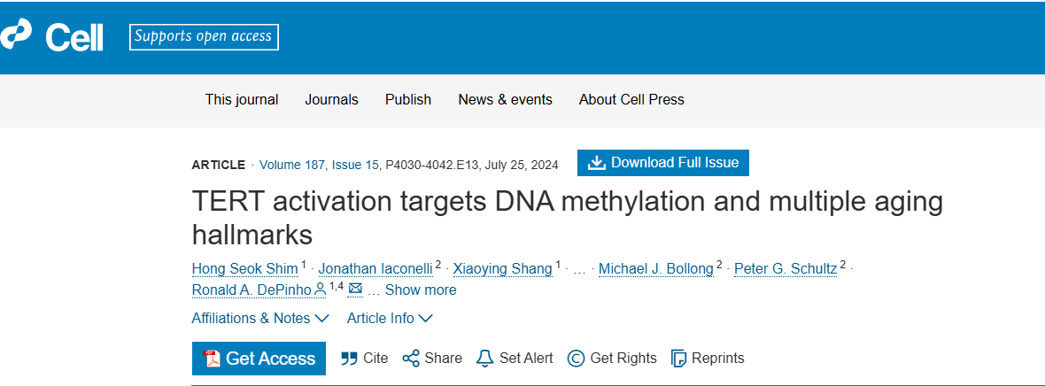 2024年6月21日,美国德克萨斯大学MD·安德森癌症中心 Ronald DePinho 教授团队在国际顶尖学术期刊 Cell 上发表了题为:TERT activation targets DNA methylation and multiple aging hallmarks 的研究论文。