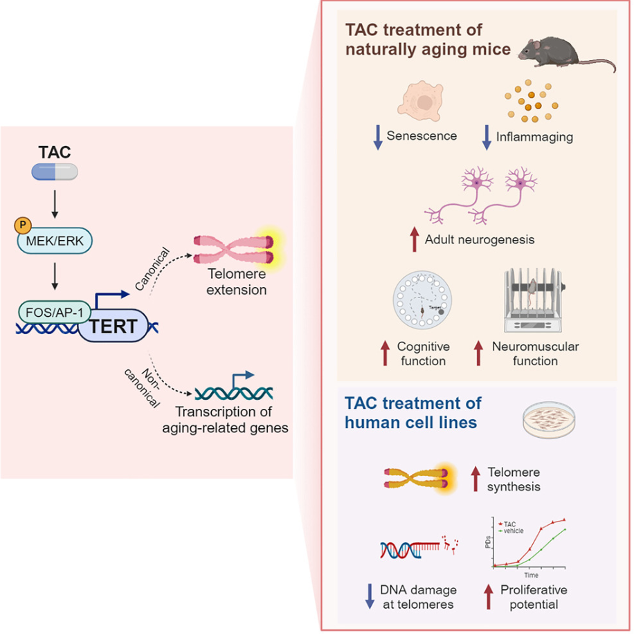 在这项最新研究中,研究团队旨在开发一种恢复TERT水平的药物,他们通过对超过65万种化合物的高通量筛选,发现了一种小分子TERT激活化合物(TERT activator compound,TAC),该化合物可以增强人和小鼠成体体细胞中的TERT转录,使其恢复到在年轻细胞中的生理表达水平,促进端粒合成,减少了端粒处的DNA损伤信号,从而逆转细胞衰老。