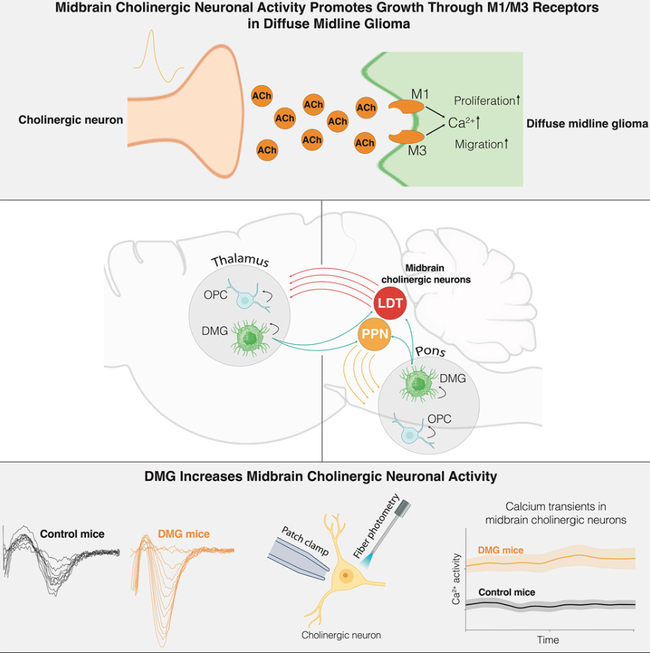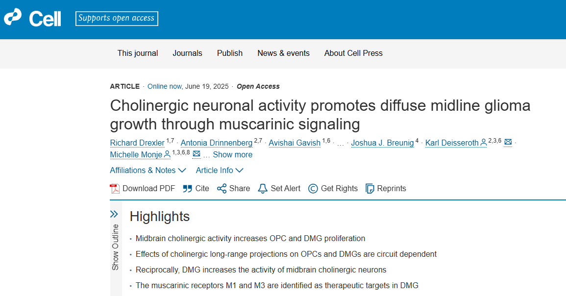 长久以来,我们认为肿瘤的生长主要由其自身的基因突变决定。但近年来,一个颠覆性的领域——癌症神经科学 (Cancer Neuroscience),正在兴起。研究人员发现,大脑的神经活动,这个维持我们生命与思维的根本过程,竟然会成为某些脑肿瘤生长的“帮凶”。此前的研究已经证实,大脑中最主要的“兴奋性”信使——谷氨酸 (glutamate),能够促进胶质瘤的生长。但这是否就是故事的全貌?大脑中还有许多其他类型的神经元,它们扮演着“调控者”的角色,影响着整个神经网络的节律和状态。这些神经元是否也参与了这场与肿瘤的“共谋”?6月19日发表在《Cell》上的重磅研究“Cholinergic neuronal activity promotes diffuse midline glioma growth through muscarinic signaling”,为我们揭开了这幕大戏的另一角。这项研究精准地锁定了一类特殊的神经元——胆碱能神经元 (cholinergic neuron),并发现它们与DMG之间存在着一种令人不安的、相互促进的“邪恶共生”关系。