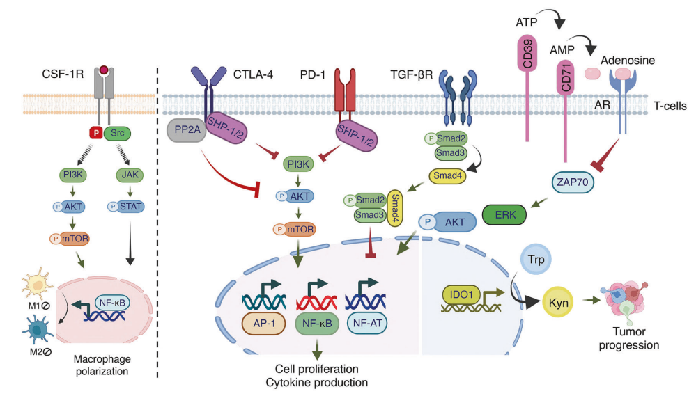 在巨噬细胞中,CSF-1 或 IL-34 与 CSF-1 受体结合,诱导快速二聚化和酪氨酸残基的自身磷酸化。这种激活通过 PI3K/AKT 和 JAK/STAT 途径触发下游信号,调节巨噬细胞的极化。活化的 T 细胞上表达的 CTLA-4 与 APC 上的 CD80/CD86 结合。一旦接合,CTLA-4 信号就会使 TCR 信号成分去磷酸化,从而抑制 CD3 和 ZAP70 的活化,并抑制 RAS 信号通路。CTLA-4 信号会破坏 AKT 磷酸化,对细胞周期进行负向调节,并抑制 NF-κB、AP-1 和 NF-AT 等关键转录因子。PD-1 与其配体相互作用,导致其胞质尾部的两个酪氨酸残基磷酸化。这种磷酸化作用会将 SHP-1 和 SHP-2 募集到 ITSM 矩阵,抑制 PI3K/AKT/mTOR 通路,降低代谢活性,促进 T 细胞衰竭。在 TGF-βR2 配体结合的情况下,受体通过与 PI3K 亚基的物理相互作用激活并促进 PI3K 和 AKT 信号传导。这种级联反应导致 mTOR 激酶激活,从而推动翻译反应。这些信号通路共同诱导 IDO1 激活,将色氨酸转化为犬尿氨酸,从而通过免疫抑制增强肿瘤的免疫逃避能力。CD39/CD73 通路将细胞外 ATP 水解为腺苷,这是一种免疫抑制代谢产物。腺苷能阻止幼稚αCD3/CD28刺激的CD8+T细胞中ZAP70、AKT和ERK1/2的酪氨酸磷酸化,从而影响它们的活化。
