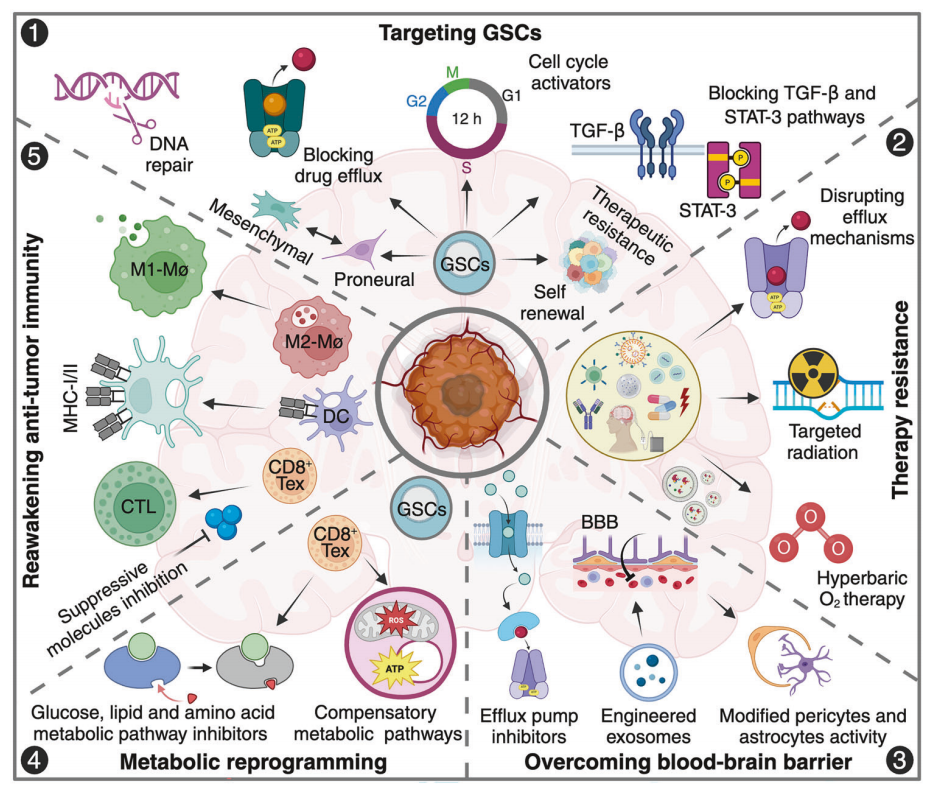 该示意图强调了 GBM 病理生理学的多面性,并强调了综合靶向治疗、免疫治疗、代谢干预和 BBB 调节策略的多模式方法对提高疗效和改善患者预后的必要性。
