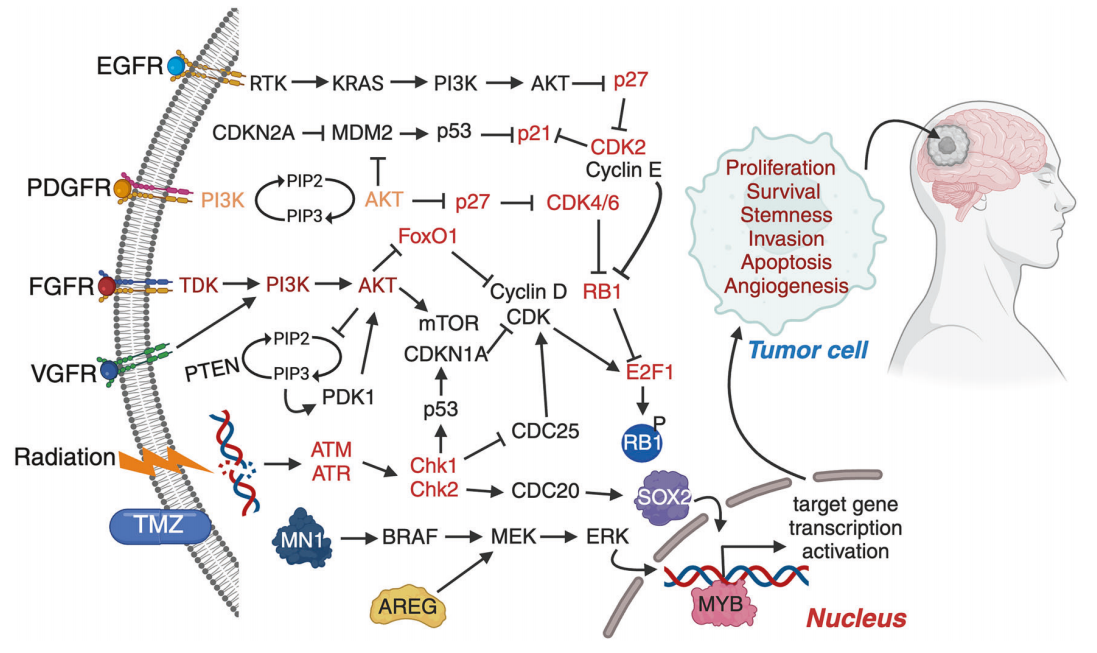 图4说明了导致胶质母细胞瘤(GBM)发生和发展的关键致癌基因改变。受体酪氨酸激酶(RTK),如表皮生长因子受体(EGFR)、表皮生长因子受体(PDGFR)、表皮生长因子受体(FGFR)和表皮生长因子受体(VGFR),启动下游信号级联,包括 PI3K/AKT/mTOR 和 RAS/RAF/MEK/ERK 通路。肿瘤抑制因子(如 PTEN、CDKN2A、RB1、p53)的缺失和癌基因(如表皮生长因子受体、MDM2、CDK4/6、TERT、MYB、SOX2、AREG)的过度激活会促进细胞周期的进展、增殖、干细胞、存活、血管生成和对凋亡的抵抗。DNA 损伤反应元件(ATM/ATR-Chk1/Chk2)会被放疗和化疗(TMZ)激活,但在 GBM 中经常被绕过。MYB和SOX2等下游转录调节因子进一步增强了肿瘤细胞的可塑性和恶性程度。总之,这些改变重塑了肿瘤细胞表型,推动了 GBM进展和耐药性。