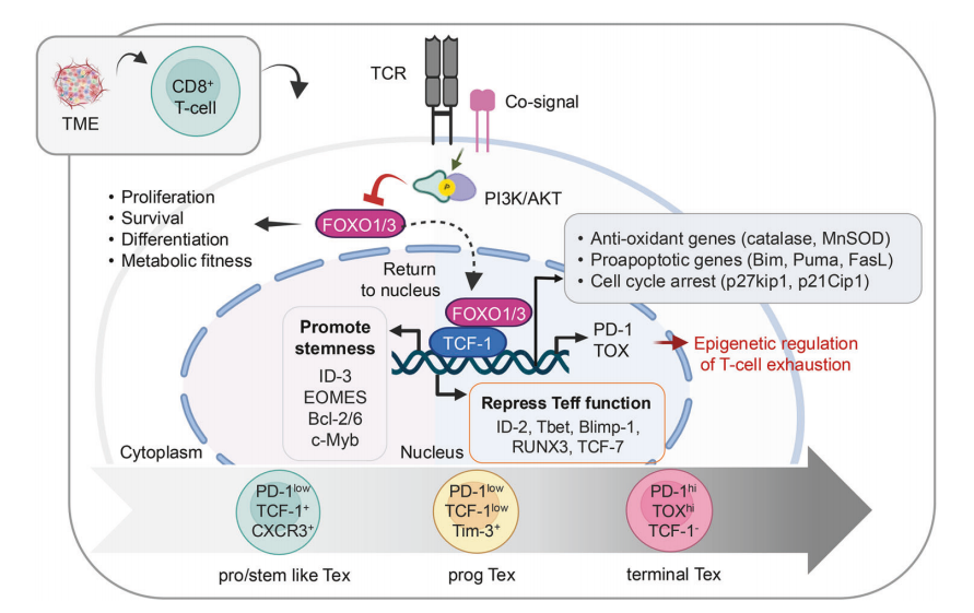 图9 描述了信号通路和转录调节因子之间错综复杂的相互作用,这种相互作用推动了 TME 中 CD8+ T 细胞的衰竭。关键通路包括PI3K/AKT信号通路和FOXO1/3转录因子的活性调节。在细胞核中,TCF-1通过上调ID-3、EOMES、Bcl-2/6和c-Myb等基因促进干性。FOXO1/3与TCF-1一起,通过调节衰竭相关基因(ID-2、Tbet、Blimp-1、RUNX3和TCF-7),抑制效应T细胞(Teff)的功能。衰竭的 T 细胞会经历一个连续过程,从祖细胞样(pro/stem-like Tex)状态(PD-1-low、TCF-1+ 和 CXCR3+)过渡到最终衰竭(terminal Tex)状态(PD-1hi、TOXhi 和 TCF-1-)。FOXO1/3 还能控制抗氧化基因和促凋亡基因,调节细胞周期停滞基因,维持细胞完整性并上调 PD-1 和 TOX。PD-1 和 TOX 起着表观遗传调控中心媒介的作用,影响染色质的可及性和转录程序,从而稳定衰竭表型。这种 PD-1 表观遗传学调控塑造了肿瘤微环境中的 T 细胞功能和代谢适应性。