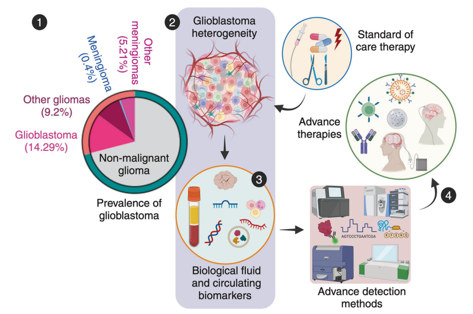图1中,1.显示了胶质瘤的发展趋势,重点是美国胶质母细胞瘤(GBM)的发病率。数据来源: Cancer Stat Facts:2014-2020 年美国国家癌症研究所监测、流行病学和最终结果计划确定的脑癌和其他神经系统癌症。2. GBM 具有明显的分子、遗传和细胞异质性,给准确诊断和有效治疗带来了巨大障碍。3.利用生物流体生物标志物(如液体活检和循环生物大分子)以及高清检测技术的先进诊断方法对于精确检测至关重要。4.这些创新技术正推动着针对 GBM 治疗的靶向和更有效疗法的发展。