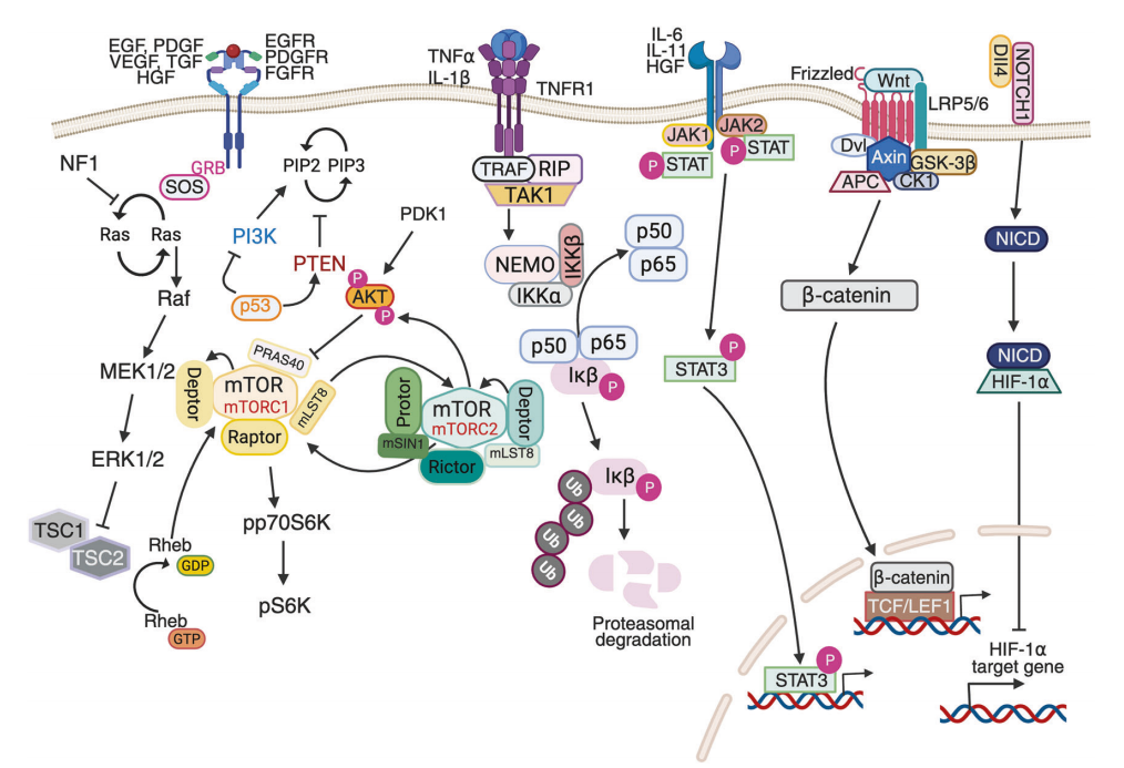 图5突出了关键的致癌信号通路及其在胶质母细胞瘤(GBM)发病机制中的相互关联作用。PI3K/AKT/mTOR、MAPK/ERK、p53、NF-κB、JAK/STAT、β-catenin 和 Notch 等失调通路共同推动了肿瘤的进展、生存和抗药性。由 TNFα/TNFR1 和 IKK 复合物引发的 NF-κB 激活整合了炎症信号,而细胞因子介导的 JAK/STAT 通路激活则促进了生存基因的转录。Wnt/β-catenin 和 Notch 通路进一步支持干性、血管生成和免疫调节。这些通路之间的交汇和串扰导致了 GBM 的复杂性和侵袭性。