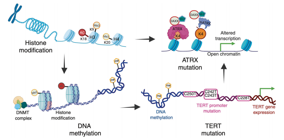 图3 描述了导致胶质母细胞瘤(GBM)发展的关键表观遗传学机制,包括组蛋白修饰、DNA 甲基化、ATRX 突变和 TERT 启动子突变。组蛋白修饰(如甲基化(Me3)和特定赖氨酸残基的乙酰化(Ac))可调节染色质的可及性和基因表达。由 DNA 甲基转移酶(DNMTs)催化的 DNA 甲基化进一步影响基因的沉默或激活。ATRX 基因突变会破坏负责 H3.3 沉积的 ATRX-DAXX 复合物,从而损害染色质重塑,导致转录改变和染色质可及性增加。TERT 启动子突变会导致端粒酶表达异常,从而导致肿瘤细胞永生。