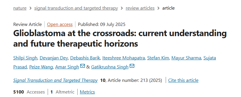 Singh S, Dey D, et al. Glioblastoma at the crossroads: current understanding and future therapeutic horizons. Signal Transduct Target Ther. 2025 Jul 9;10(1):213.