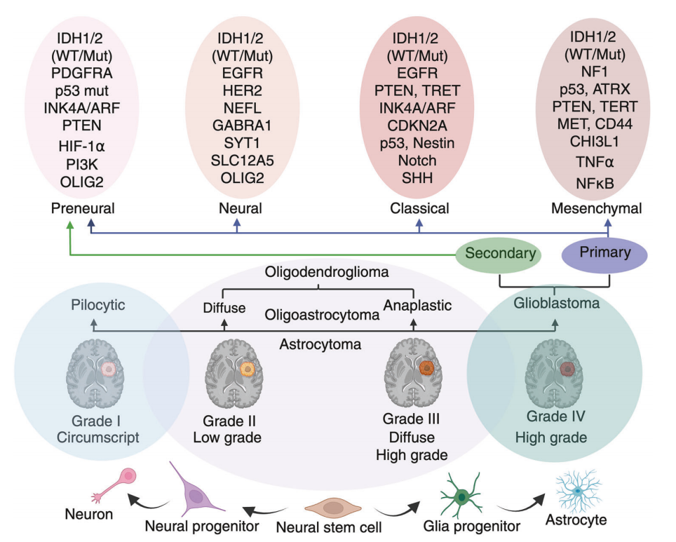 图2胶质瘤的分子分类和组织病理学分级示意图,以及其细胞起源和发展过程。从神经干细胞到神经元、星形胶质细胞和胶质祖细胞的发展脉络。嗜酸性星形细胞瘤(Ⅰ级)通常是局限性和低级别的,而弥漫性星形细胞瘤(Ⅱ级)、无弹力星形细胞瘤(Ⅲ级)和胶质母细胞瘤(Ⅳ级)则代表恶性和浸润行为的进展阶段。顶部面板突出显示了胶质母细胞瘤的分子亚型:绒毛膜亚型、神经亚型、典型亚型和间质亚型,每种亚型都由不同的基因,如 IDH1/2、表皮生长因子受体(EGFR)、p53、PTEN、NF1 和其他基因改变所定义。这些亚型与胶质母细胞瘤的原发(新发)或继发(从低级别胶质瘤发展而来)起源相关。这种分类强调了胶质瘤的诊断、预后和治疗决策需要结合分子和临床参数。