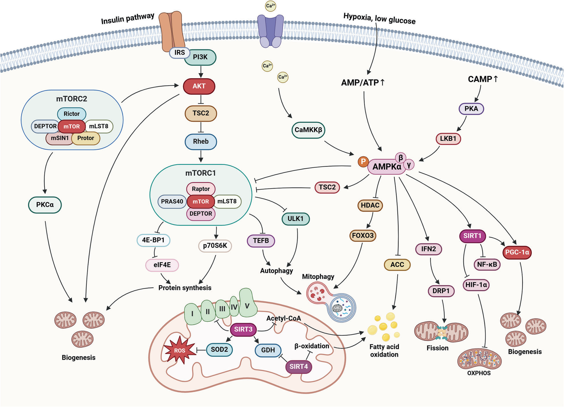 癌细胞的存活依赖于复杂且动态调控线粒体功能的信号网络。胰岛素通路通过激活 PI3K 和 AKT 刺激 mTORC1 来驱动细胞生长;而 AMPK 则在应激条件下充当关键的代谢传感器。当 AMPK 激活时,它通过与 ULK1、SIRT1 和 PGC-1α 等关键蛋白相互作用,调控线粒体动力学、自噬及能量代谢。此外,SIRT3 等线粒体蛋白通过管理氧化应激和维持代谢平衡,进一步促进细胞适应性。这些相互关联的信号通路使癌细胞能够在恶劣环境中存活并适应,也提示了潜在的治疗干预靶点。