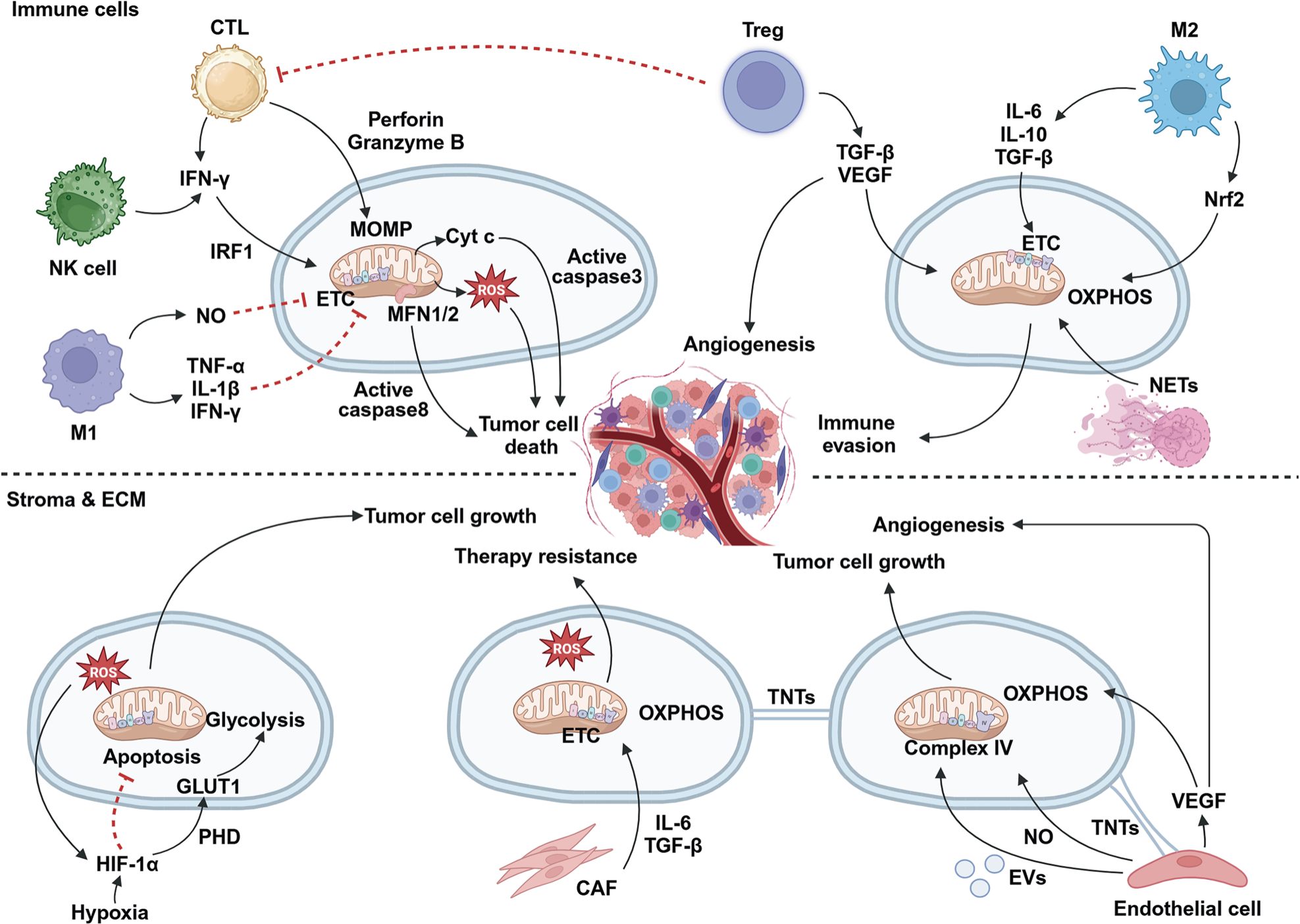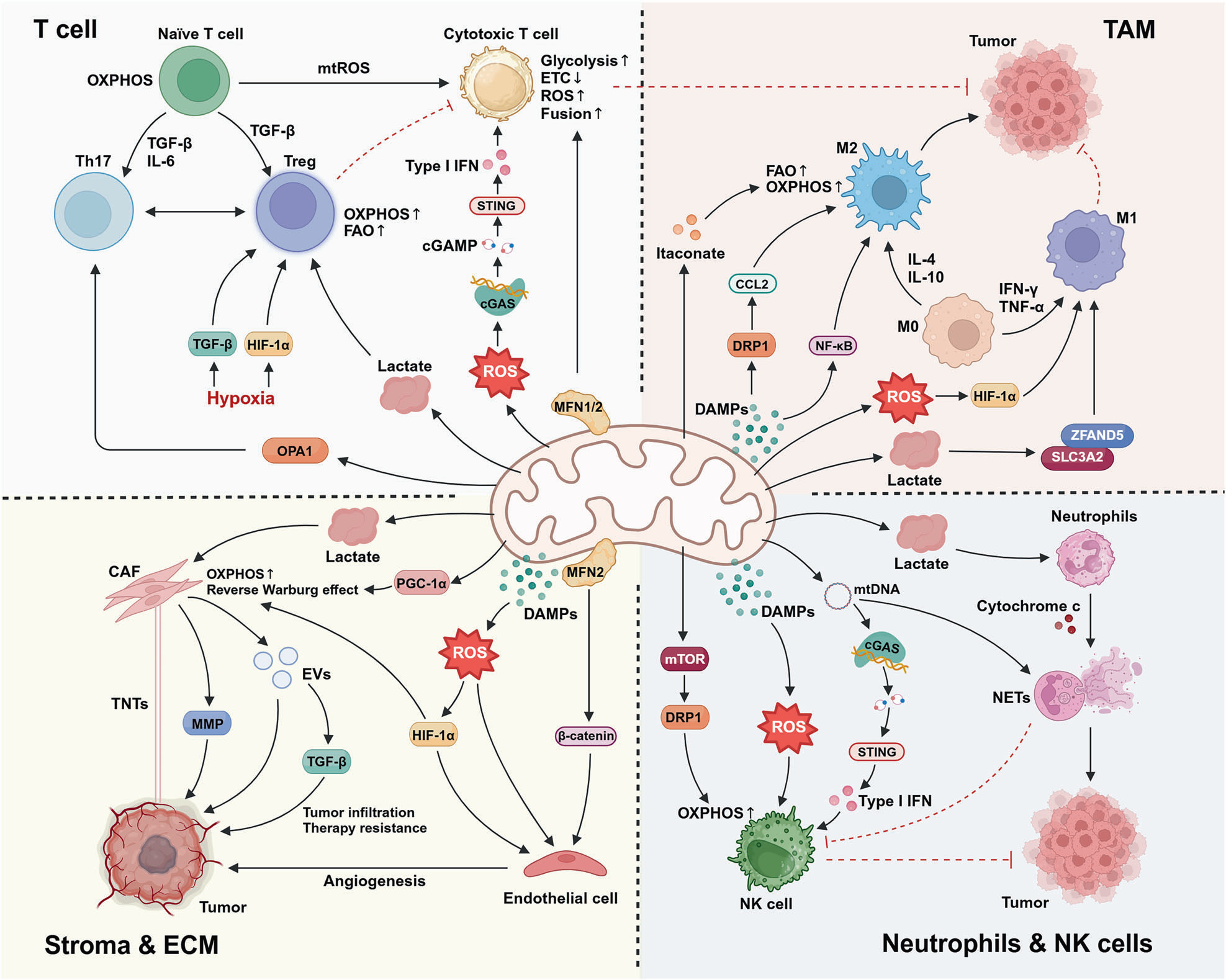 线粒体在肿瘤细胞与肿瘤微环境(TME)中浸润的各种免疫细胞群之间的动态相互作用中发挥核心作用。尽管肿瘤细胞常通过重塑自身线粒体以增强增殖和生存能力,但这些变化对免疫细胞线粒体产生多方面影响,既塑造抗肿瘤反应,也诱导免疫抑制反应。