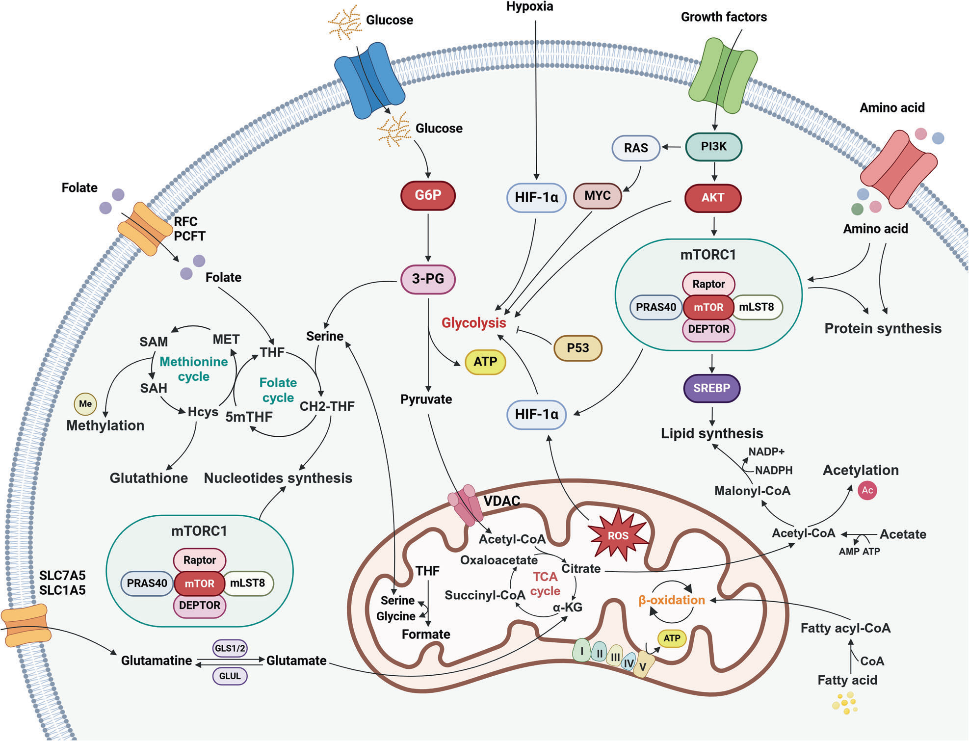 癌细胞发展出精密的代谢策略,以在恶劣条件下维持其持续增殖。这些适应性改变包括:增强葡萄糖摄取(即瓦伯格效应 / Warburg effect)、提升谷氨酰胺代谢以补充能量循环、激活一碳代谢支持生物合成、以及进行线粒体重编程以促进脂质生成和维持氧化还原平衡。通过动态调节这些代谢途径,癌细胞能够生成必需的代谢中间体,维持高效的生物能量供应,从而在通常抑制细胞生长和功能的营养匮乏或低氧环境中存活下来。