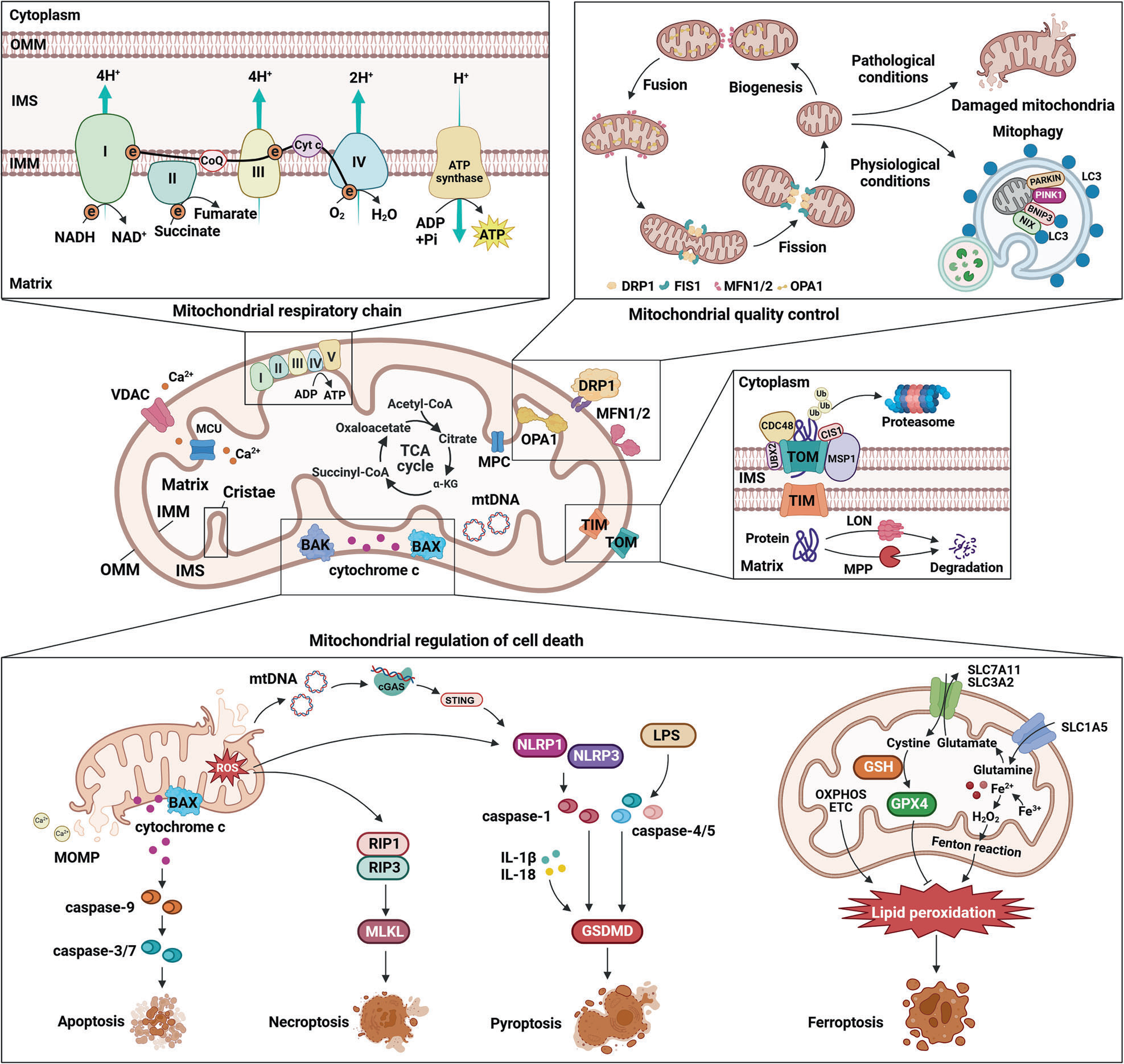 线粒体是具有复杂结构的细胞器,其精密的构造包含外膜、内膜、嵴(内膜折叠形成的结构)以及众多关键蛋白质,这些结构共同促进了能量产生和细胞调控。线粒体呼吸链通过电子传递和质子泵送驱动 ATP 合成;与此同时,融合、分裂和线粒体自噬等质量控制机制则维持着细胞的健康状态。线粒体过程调控着包括凋亡、坏死性凋亡、焦亡和铁死亡在内的多种细胞死亡途径。这些过程涉及关键的蛋白质和信号分子,它们介导细胞对压力和损伤的响应,最终确保细胞存活与清除的精确控制。