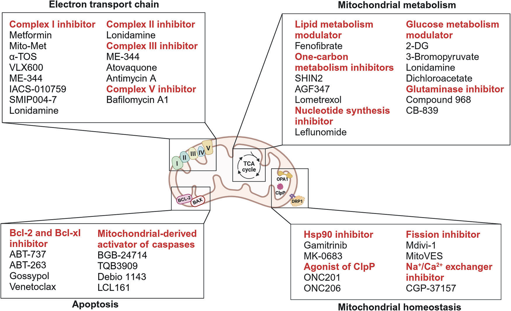 该示意图展示了线粒体靶向治疗的四大主要干预领域:首先是靶向复合体 I-IV 的电子传递链抑制剂;其次是调节线粒体代谢的化合物,其作用机制涵盖调控脂质代谢、葡萄糖代谢、一碳代谢及谷氨酰胺代谢;第三类为凋亡通路调节剂,包括靶向抗凋亡蛋白 Bcl-2/Bcl-xl 的抑制剂以及线粒体源性胱天蛋白酶(caspase)激活剂;最后则是线粒体稳态调节剂,这类干预手段包含热休克蛋白90(Hsp90)抑制剂、酪蛋白溶解蛋白酶(ClpP)激动剂、线粒体分裂调节剂以及钠钙交换(Na+/Ca2+ exchanger)调节剂。
