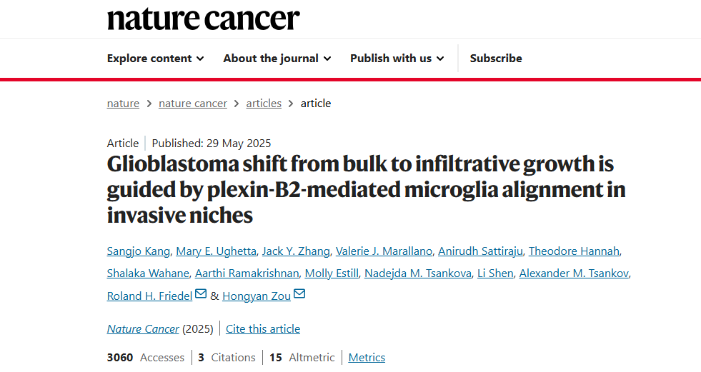Kang S, et al. Glioblastoma shift from bulk to infiltrative growth is guided by plexin-B2-mediated microglia alignment in invasive niches. Nat Cancer. 2025 May 29:10.1038/s43018-025-00985-4.